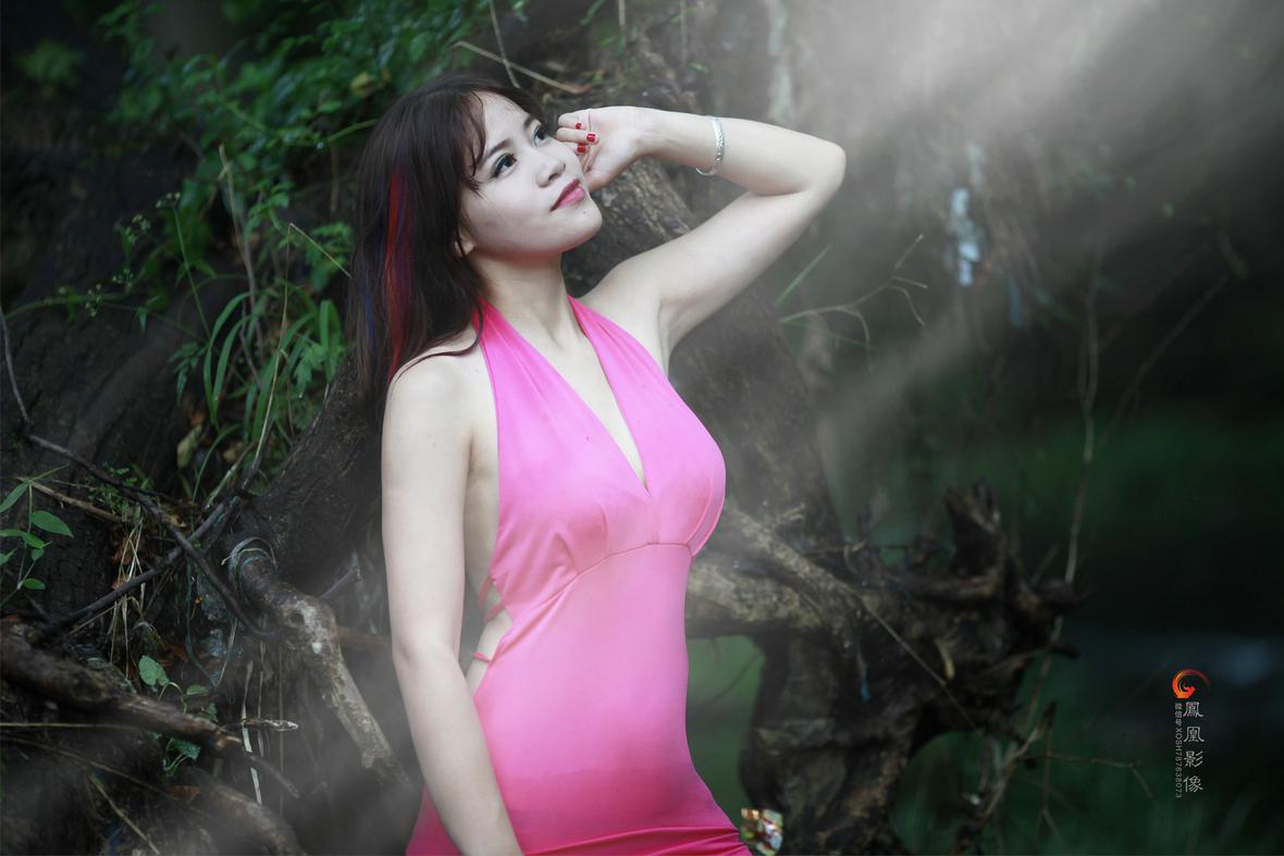 静观,瀑布与美女,自然与时尚,神奇的混搭。瀑布般的长发、玫红色比基尼,,跟那原始的岩石的黄、飘逸的瀑布的白、淳朴的栏杆的绿,竟是那么和谐!一种大自然的柔媚,令人对大自然造化的肃然起敬……