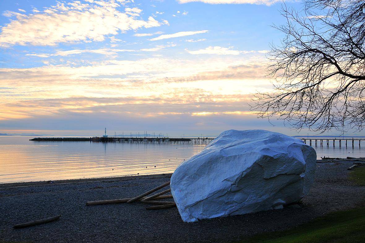 白石镇(White Rock)离温哥华市区大约45分钟车程,全城只有5平方里,镇上多数居民为退休或度假人士,沿着綿延的海岸线再南行5分钟便是美国与加拿大的边境处,美国人喜欢周末过境来白石镇度假,白石鎮是旅客都喜欢去的地方,主角当然就是那大大的白色石頭啦!