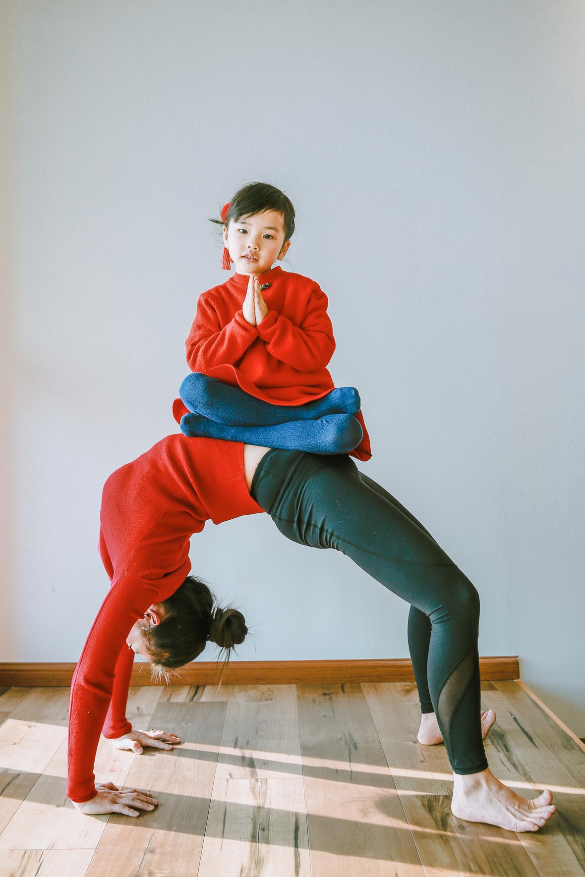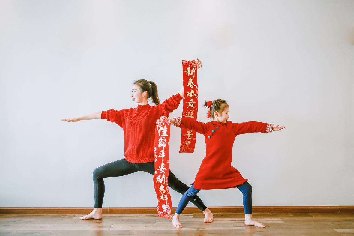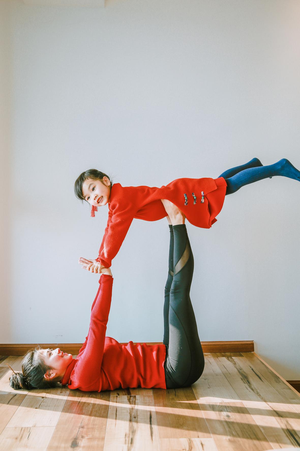 和元元认识好久好久了,那天在她朋友圈看到她的女儿穿着红色棉袄的照片,喜气洋洋的,这便约了回头拍点亲子瑜伽的照片吧。