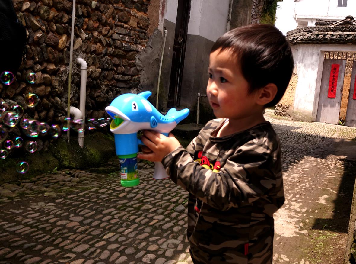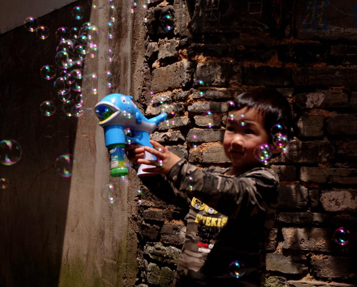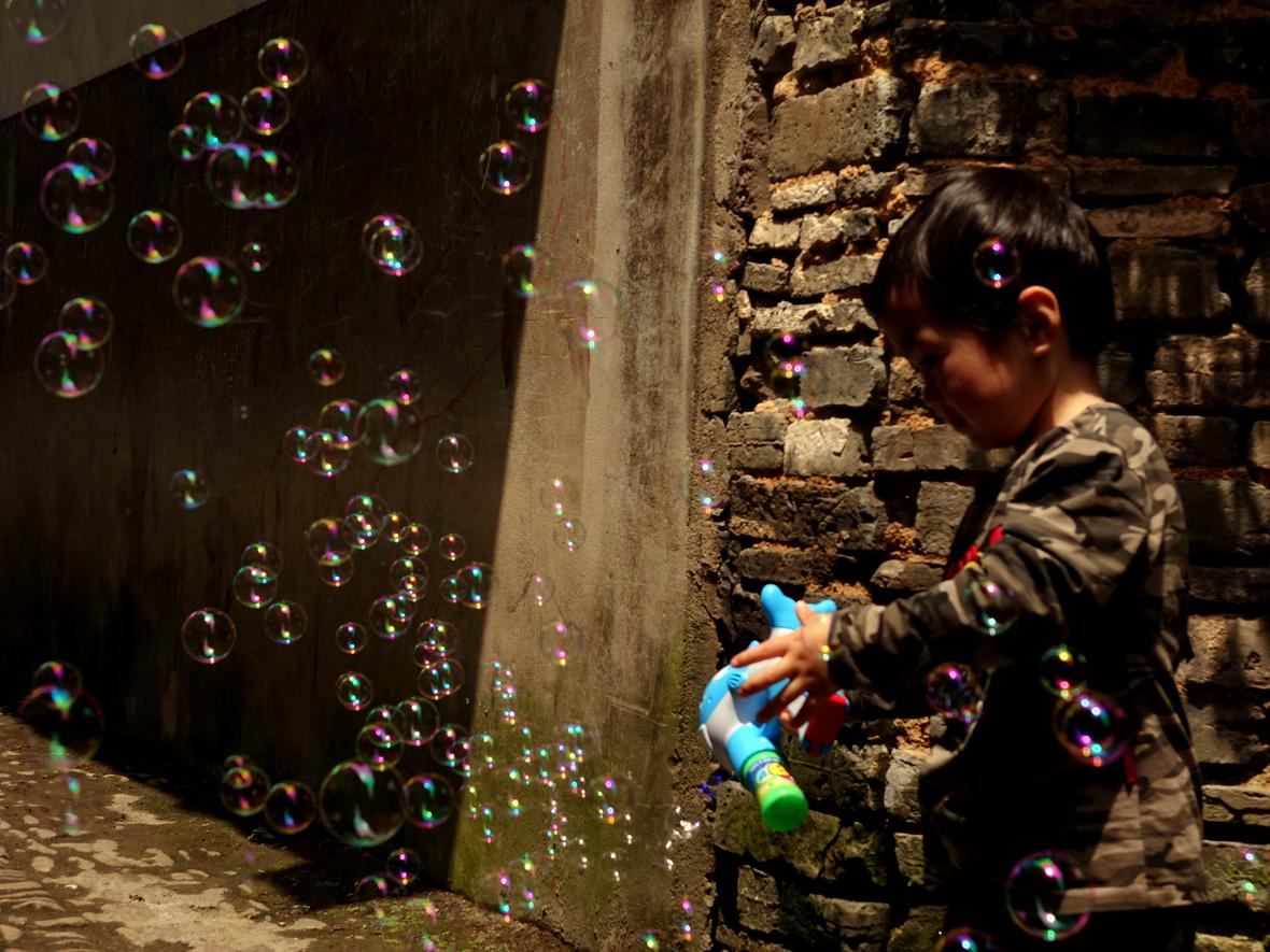 手拿游戏枪,喷泡泡的小男孩,在阳光下老巷古墙也焕发新机。