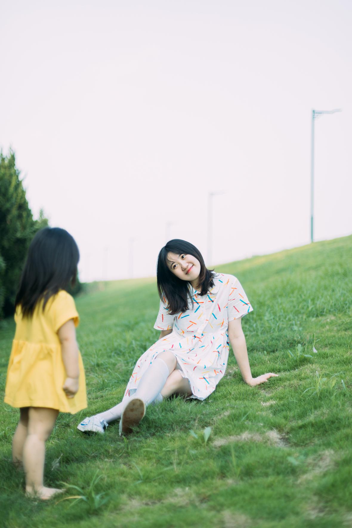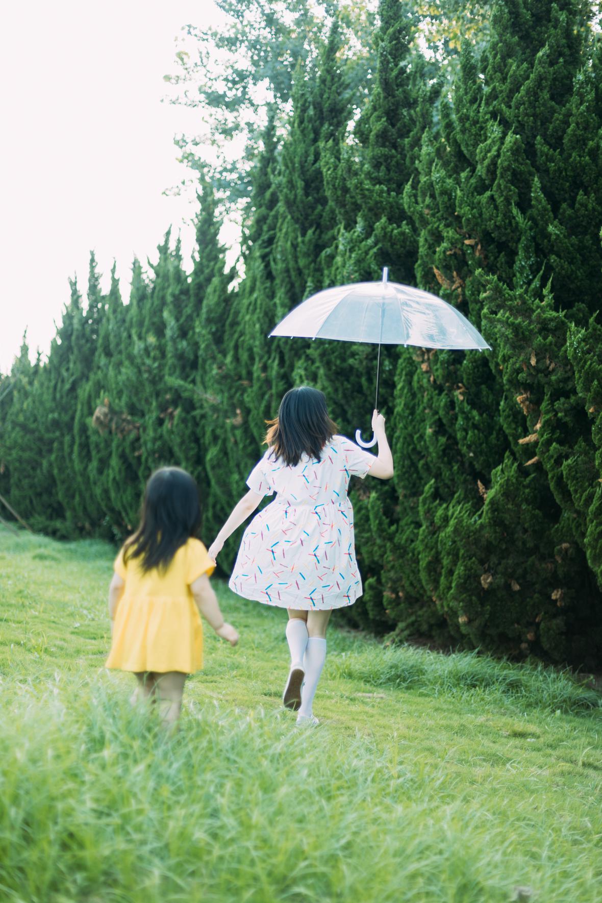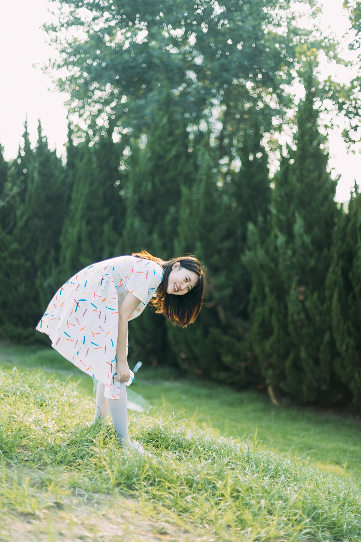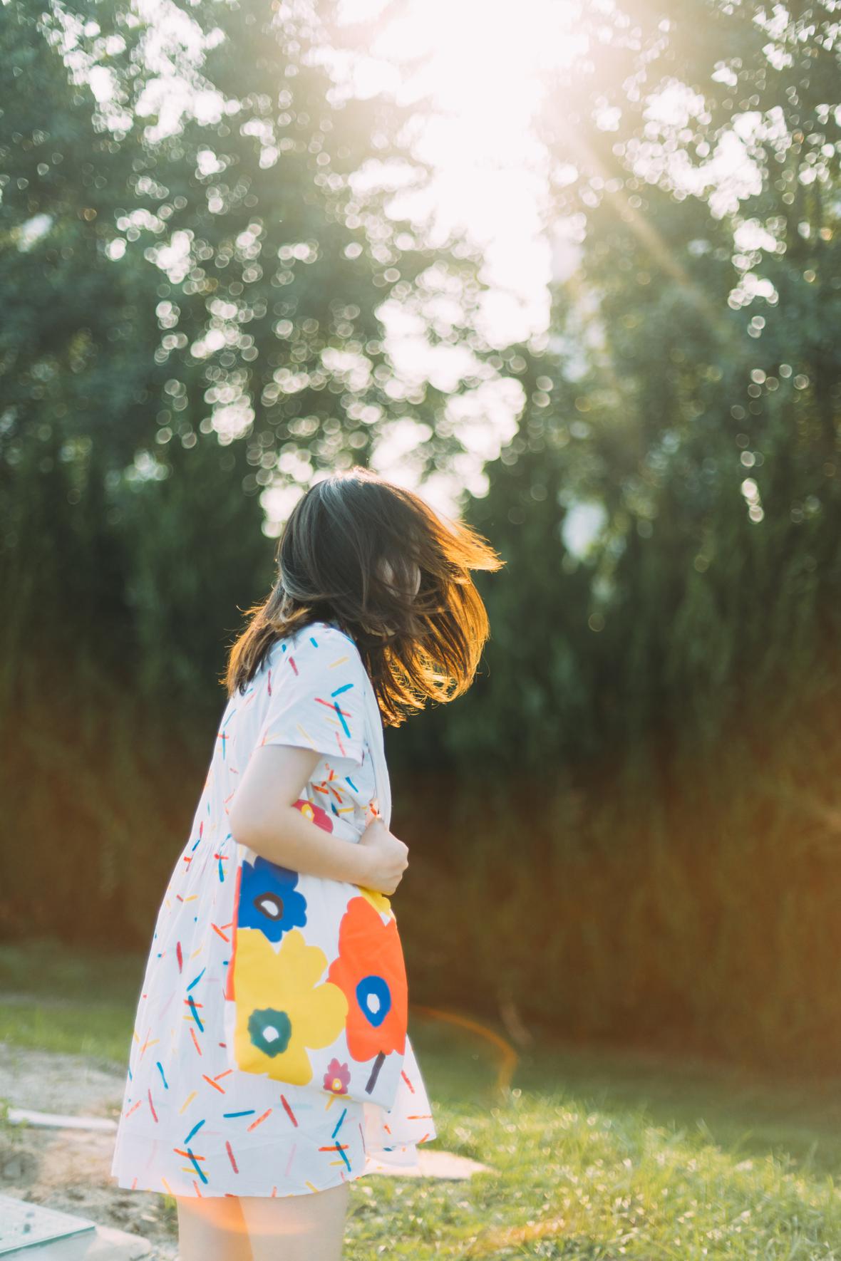 在阳光下,穿花裙子,跑来跑去。