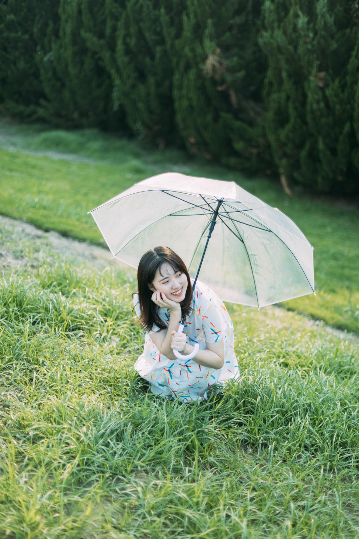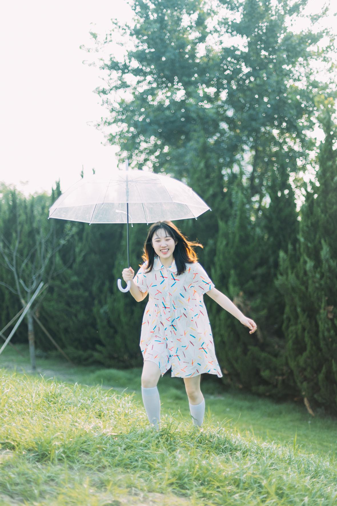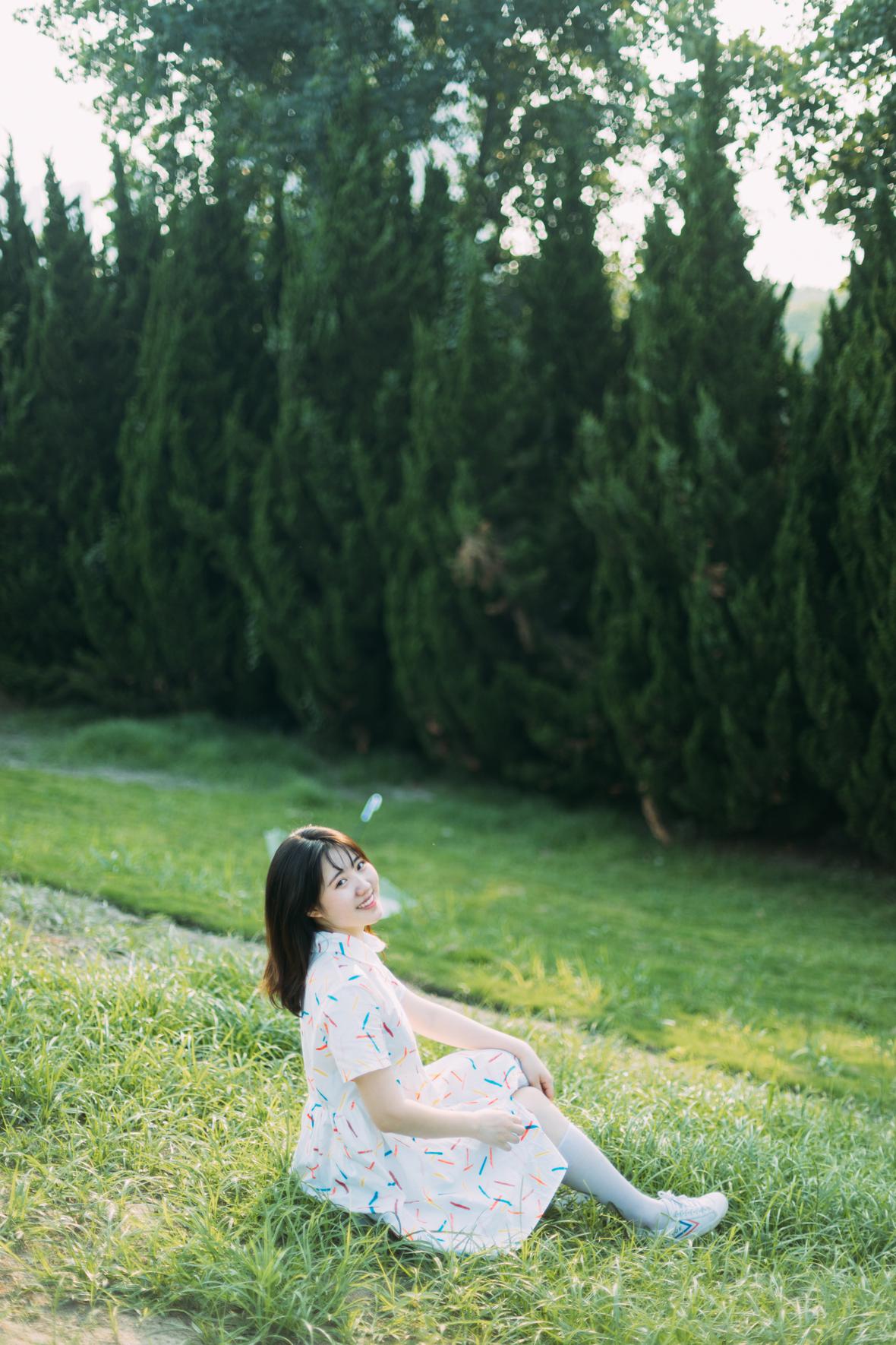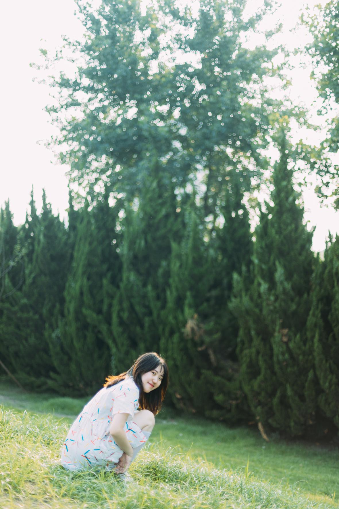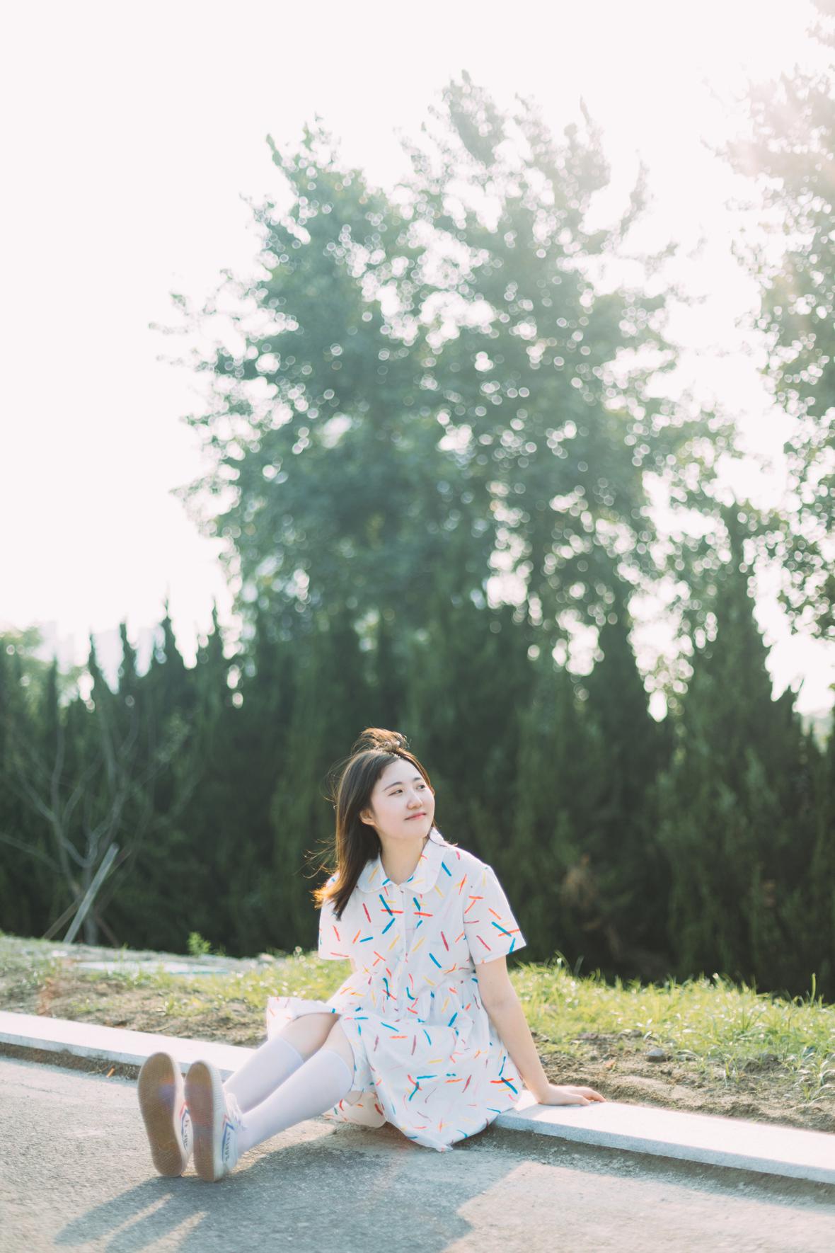 在阳光下,穿花裙子,跑来跑去。