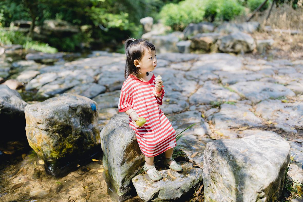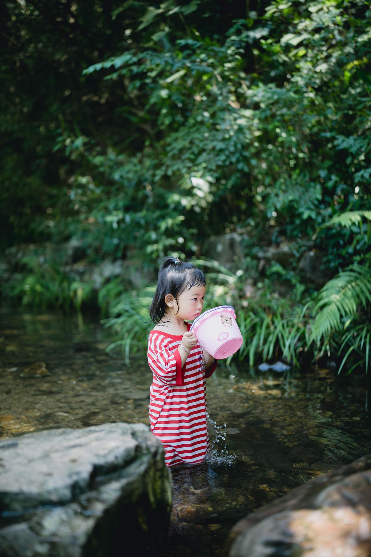 对于菲比而言,这是她第一次体验九溪的快乐。仅一只粉色小桶,就让她乐不可支。22个月的她会说“还要玩”“没有鱼”“冰冰凉”“呦呦切克闹”,以及会将打满水的水桶递给新认识的小男孩说“哥哥帮我拿拿”,小奶音,超好玩。