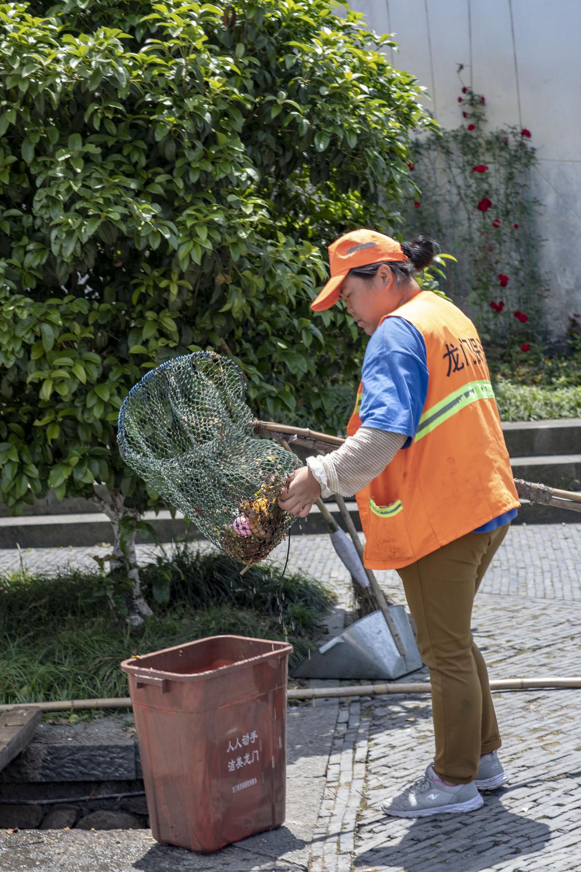 百花簇拥的龙门古镇,游客众多,一些头戴小黄帽,身着黄背心的青洁员,手拿垃圾袋、火钳等工具,一遍遍清扫着景区的垃圾,甚至下到溪沟里捞取垃圾,还不厌其烦地向游客宣传环保知识。一个农村古镇能有这等清洁整齐的环境,真要感谢这些辛劳的美容师!
