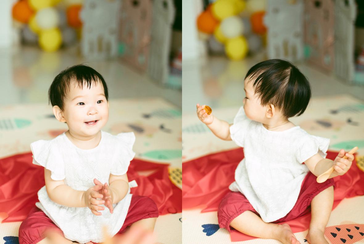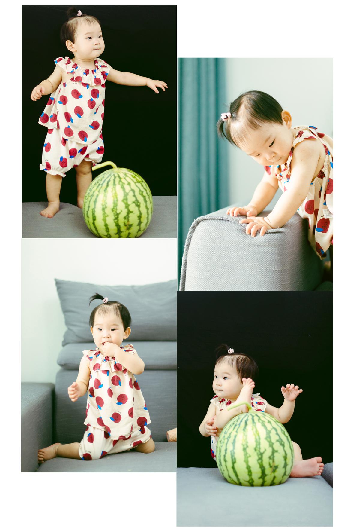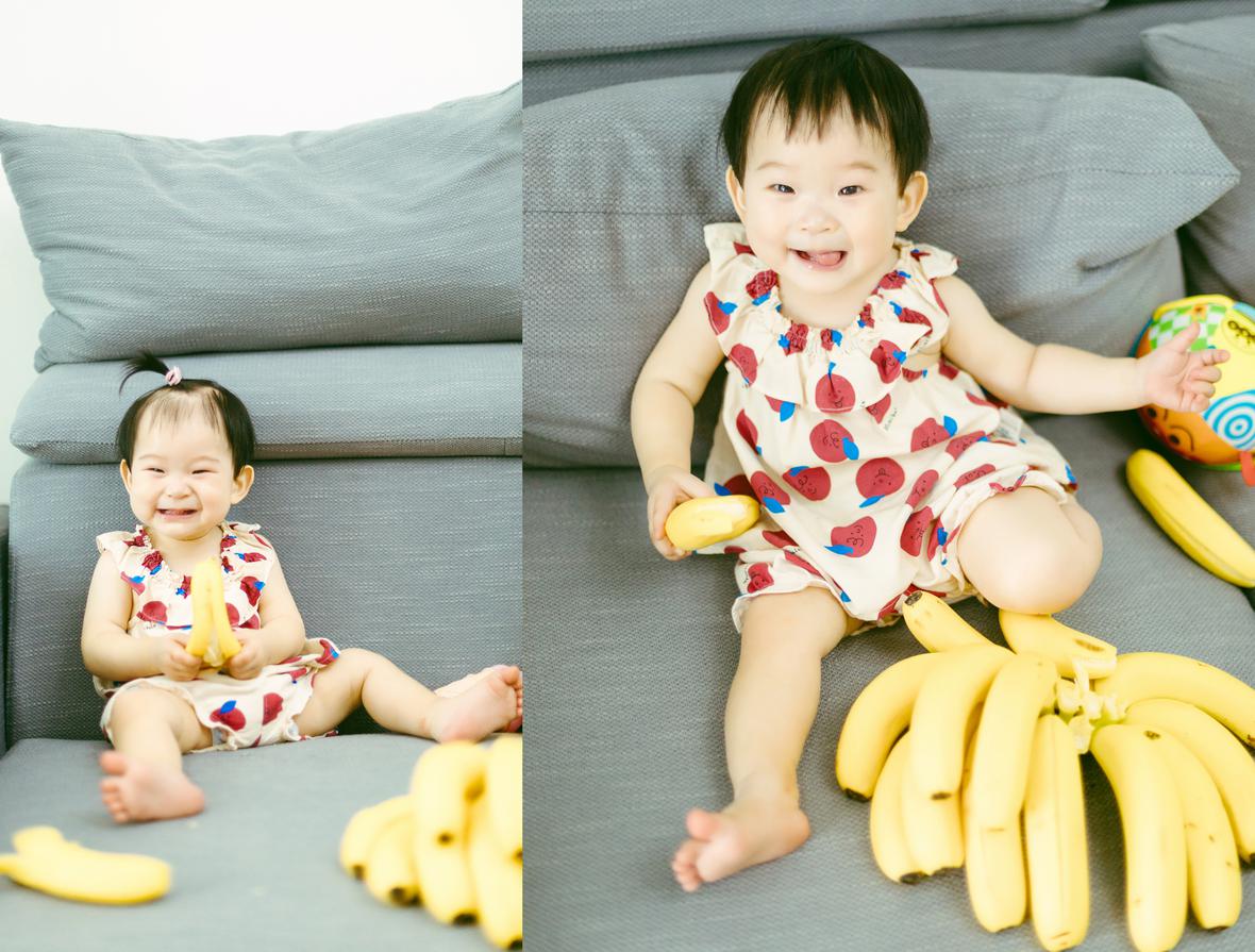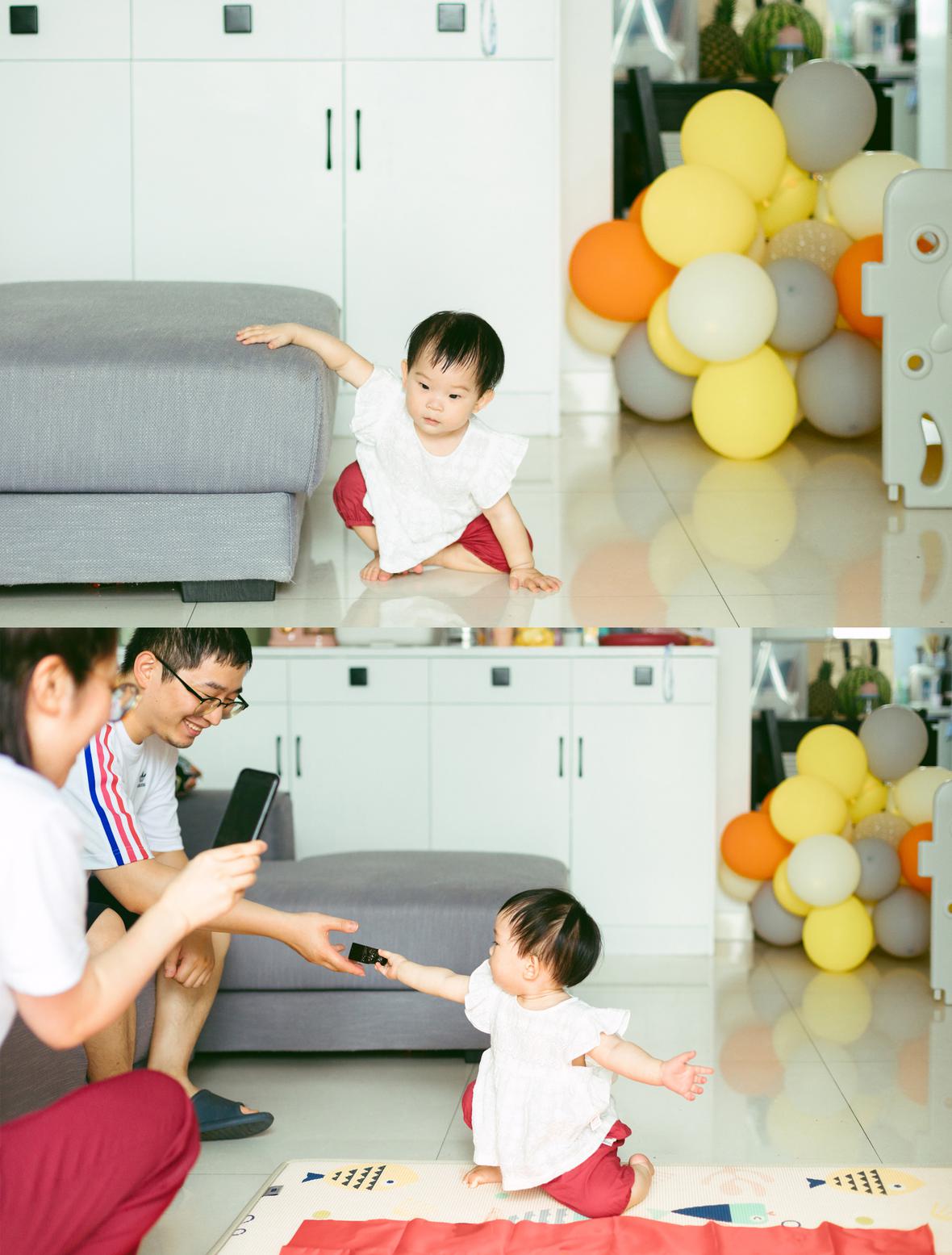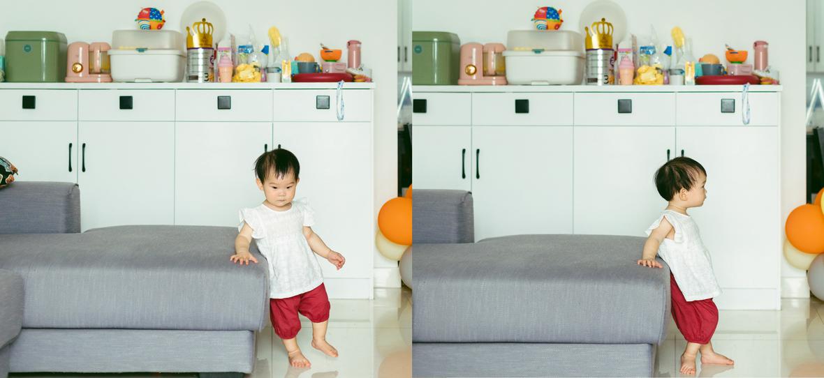 考拉已经会走路,想让她在沙发上拍几张照,发现她已然有自己的想法,呲溜下就要爬下沙发去玩,要几个大人费好一统劲才能哄她多坐一会儿。