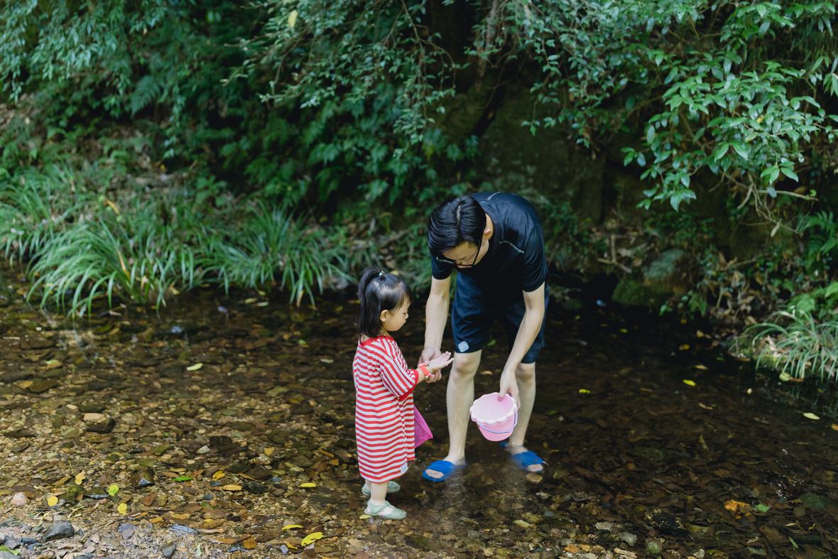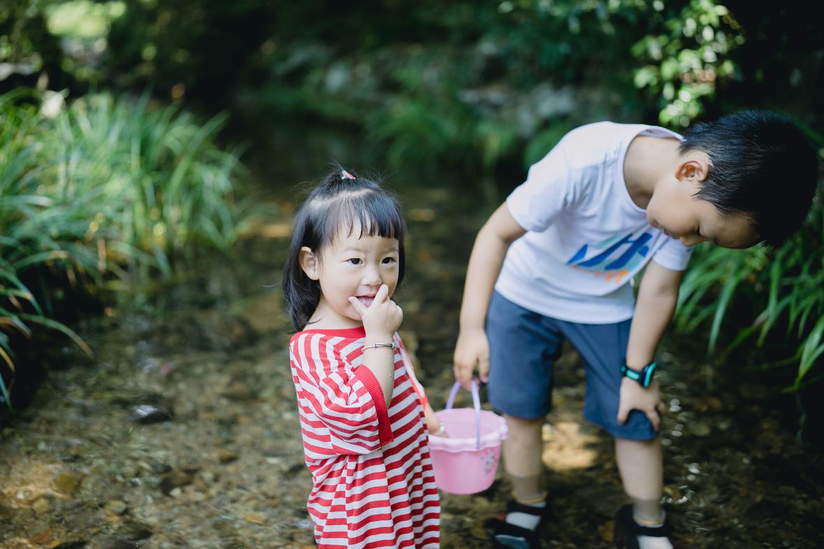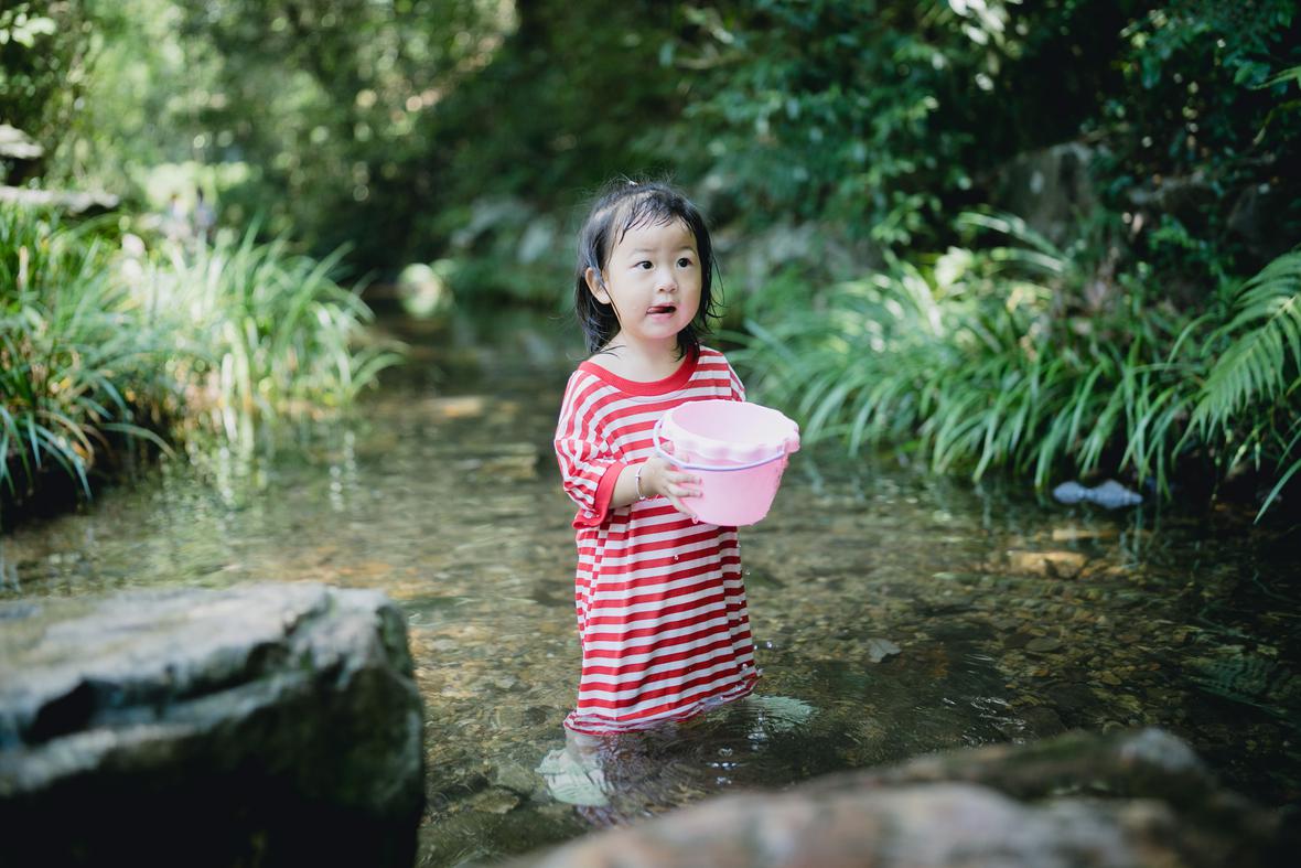 对于菲比而言,这是她第一次体验九溪的快乐。仅一只粉色小桶,就让她乐不可支。22个月的她会说“还要玩”“没有鱼”“冰冰凉”“呦呦切克闹”,以及会将打满水的水桶递给新认识的小男孩说“哥哥帮我拿拿”,小奶音,超好玩。